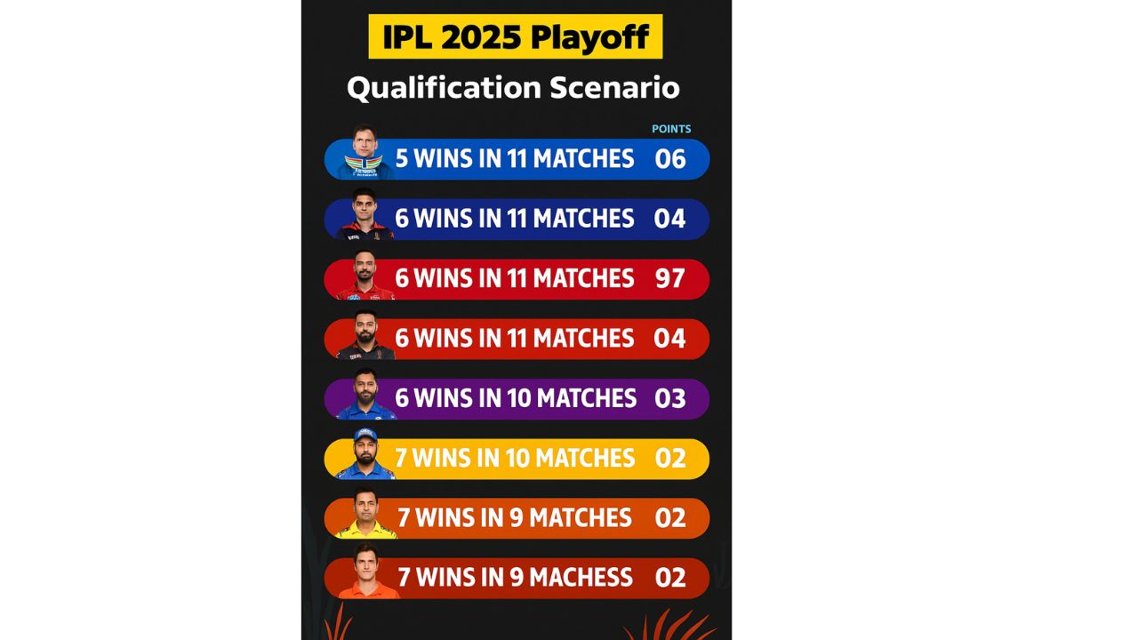 Each team plays 14 matches in the IPL league phase. This means they have only 9 matches remaining. To qualify for the playoffs, they must win at least seven of these nine matches. Ideally, teams need at least 16 points to make it to the playoffs, though it is possible with 14 points, but this has only happened in rare cases.