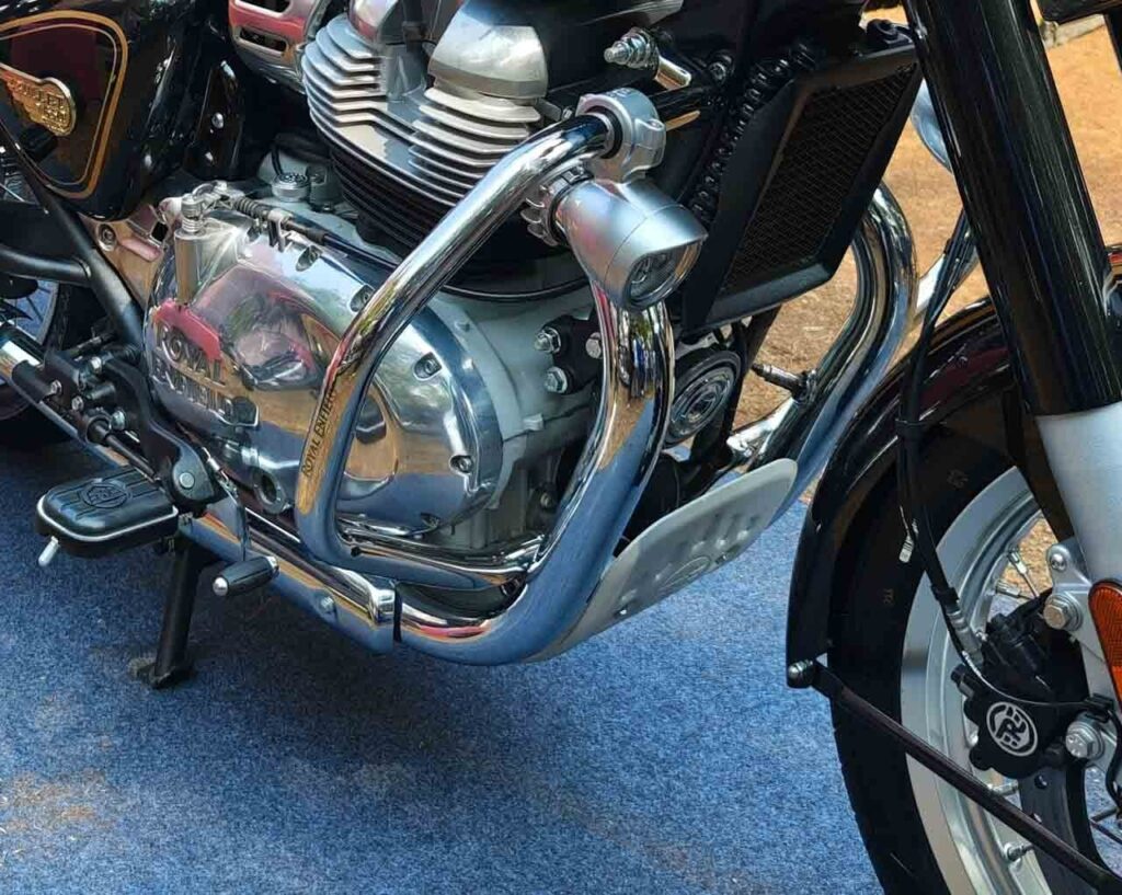 Both touring or regular city ride features of bike are very important in situations. The chrome-finished engine guard shown on the Bullet 650 helps keep the bike safe in the event of a fall. Also, engine guard is also considered necessary to mount auxiliary lights.