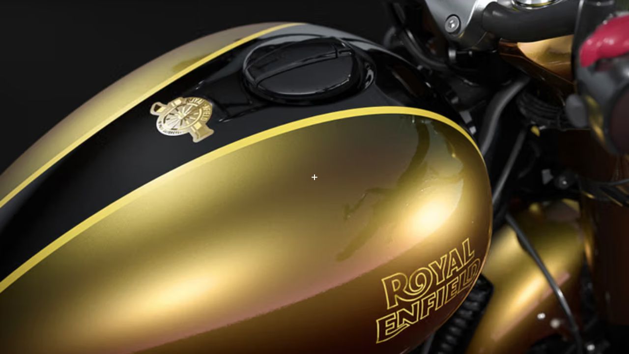 The most striking feature of this Anniversary Edition is its paint job. Royal Enfield has named it “Hypershift.” It’s a special color-morphing treatment that shifts between deep red and rich gold. As light shines on the bike’s surface, its color appears to change, creating a magical effect. The bike also features a special ‘125 Years’ insignia on the tank, further enhancing its distinctive identity. The side panels also feature the same celebratory crest. This paint job gives the bike a rare and premium look, like a collector’s item.