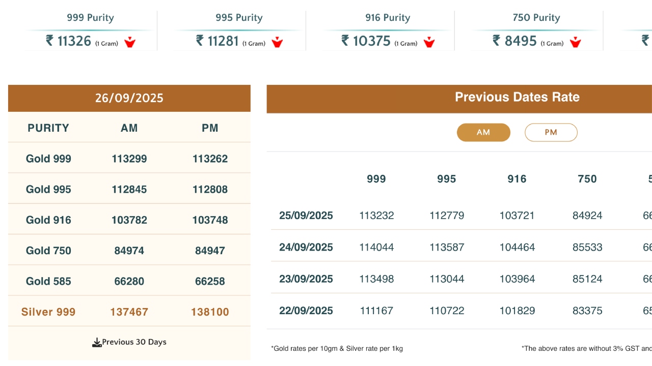 According to the rates published on ibjarates.com on the morning of September 26, the price of 995 purity gold is ₹112808 per 10 grams. Meanwhile, the cost of 22-carat gold with a purity of 916 is ₹ 103,748 per 10 grams. Furthermore, the price of 750 purity gold has risen to ₹84947 per 10 grams. The price of 585 purity gold is ₹66,258 per tola.