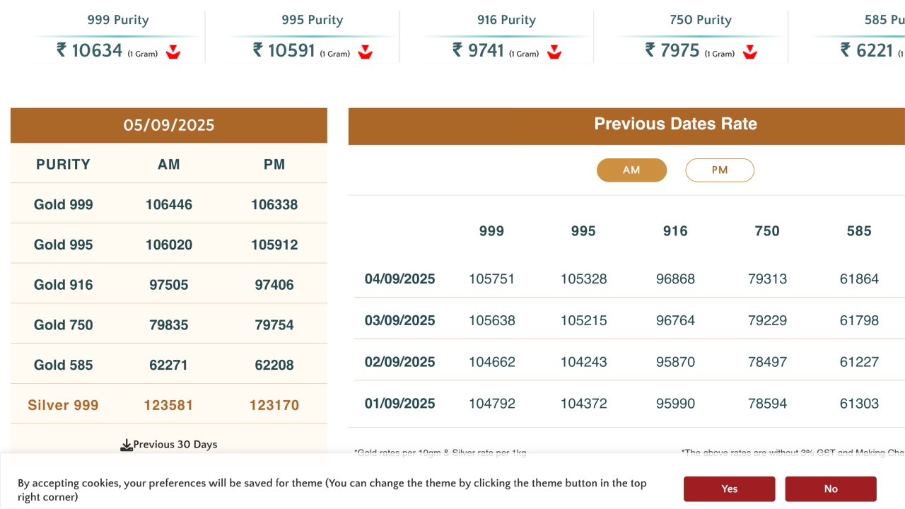 The latest rates, as of September 5, have been released on the official website of the India Bullion and Jewellers Association (IBJA), ibjarates.com. At the national level, the cost of 995 purity gold today was Rs 105912 per 10 grams. At the same time, the price of 22-carat gold of 916 purity was being sold at Rs 97406 per 10 grams till this morning. Apart from this, the cost of 18-carat gold of 750 purity was Rs 79757 per 10 grams as of this morning. At the same time, the price of 14-carat gold, with a purity of 585, was Rs 62208 per 10 grams.