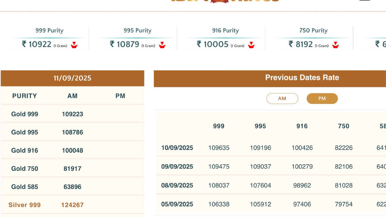 According to the India Bullion and Jewellers Association (IBJA), gold fell by Rs 412 to Rs 1,09,223 per 10 grams on Thursday. Earlier, gold remained at Rs 1,09,635 per 10 grams. At the same time, silver has come down by Rs 327 to Rs 1,24,267 per kg. Earlier, it was priced at Rs 1,24,594. If you are thinking of buying gold, then before that, you should know the latest rate of gold:-