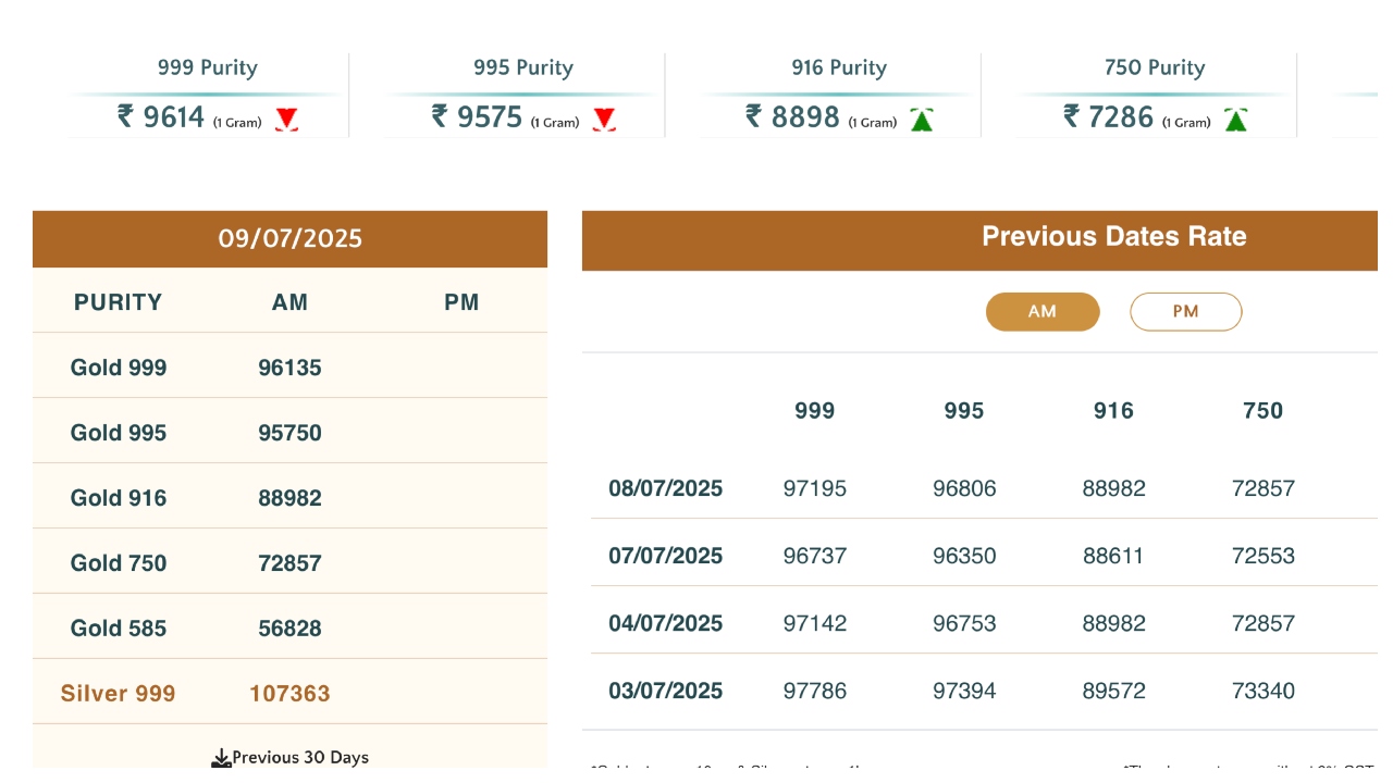 Gold Price Today:- Changes are being seen in the price of gold and silver every day. On July 9, there was a slight decline in the prices of gold and silver. Today, the price of 24-carat gold has come down by Rs 837 in the bullion markets, while the price of silver has fallen by Rs 137. Gold with 999 purity has opened at Rs 96135 today. 24-carat gold with GST is being sold at the rate of Rs 9,901.90 per 10 grams. The price of 999 purity silver today is Rs 107363 per kg. If you are considering buying gold, it is essential to know the current gold rate before making a purchase.