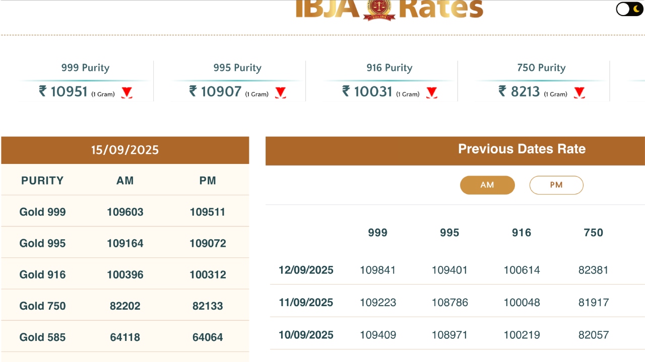 The prices of gold and silver in the Indian bullion market declined today (September 15). According to the India Bullion and Jewellers Association, the price of 24-carat gold with 999 per cent purity remains at Rs 109,511 per 10 grams today. Whereas, the price of silver with 999 purity is Rs 127791 per kilo. Let us know today’s rate.