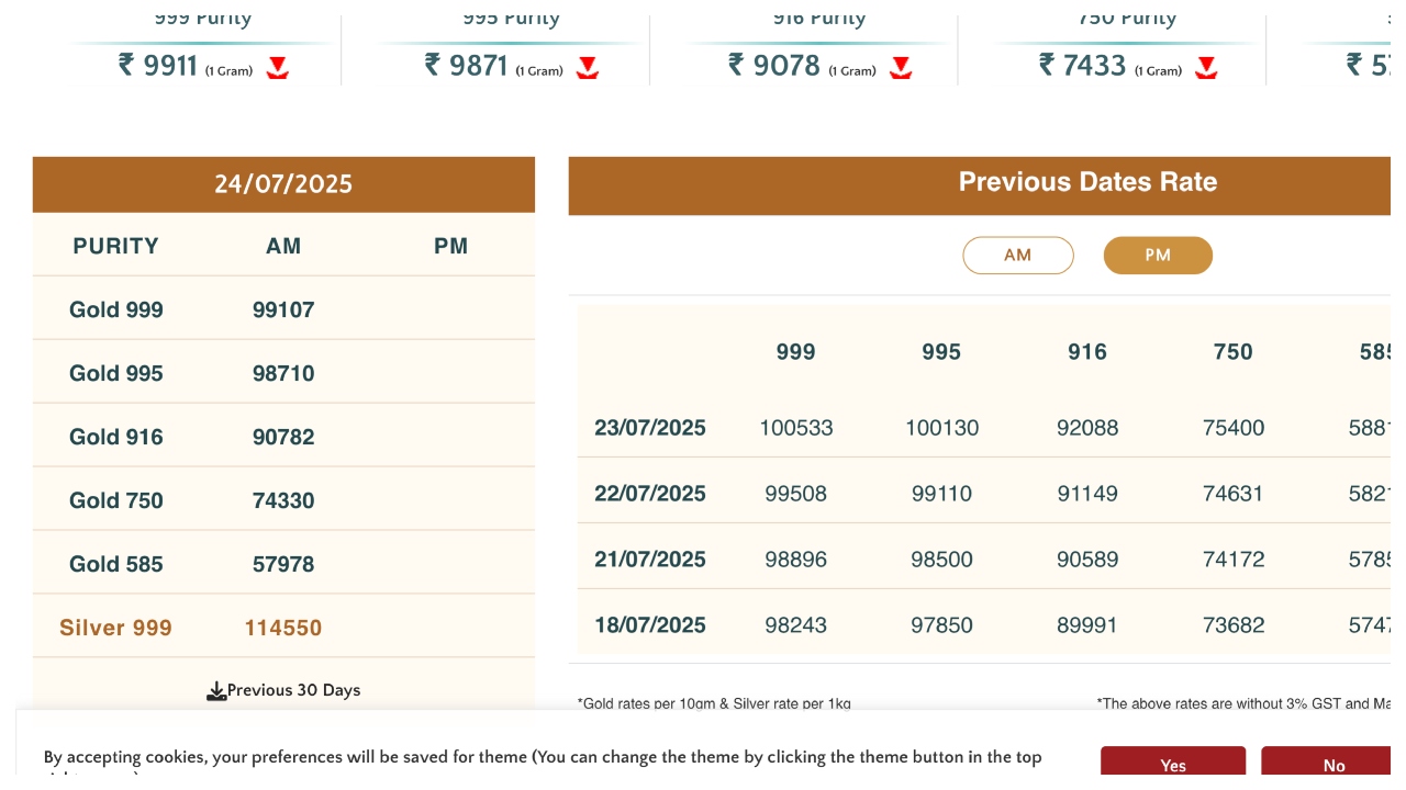 At the same time, the price of silver is trending down by ₹ 1,300 to ₹ 1,14,550 per kg. Earlier silver was at ₹ 1,15,850. On July 23, gold and silver reached their all-time high. But on July 24, a slight decline was recorded in the rate of gold and silver.