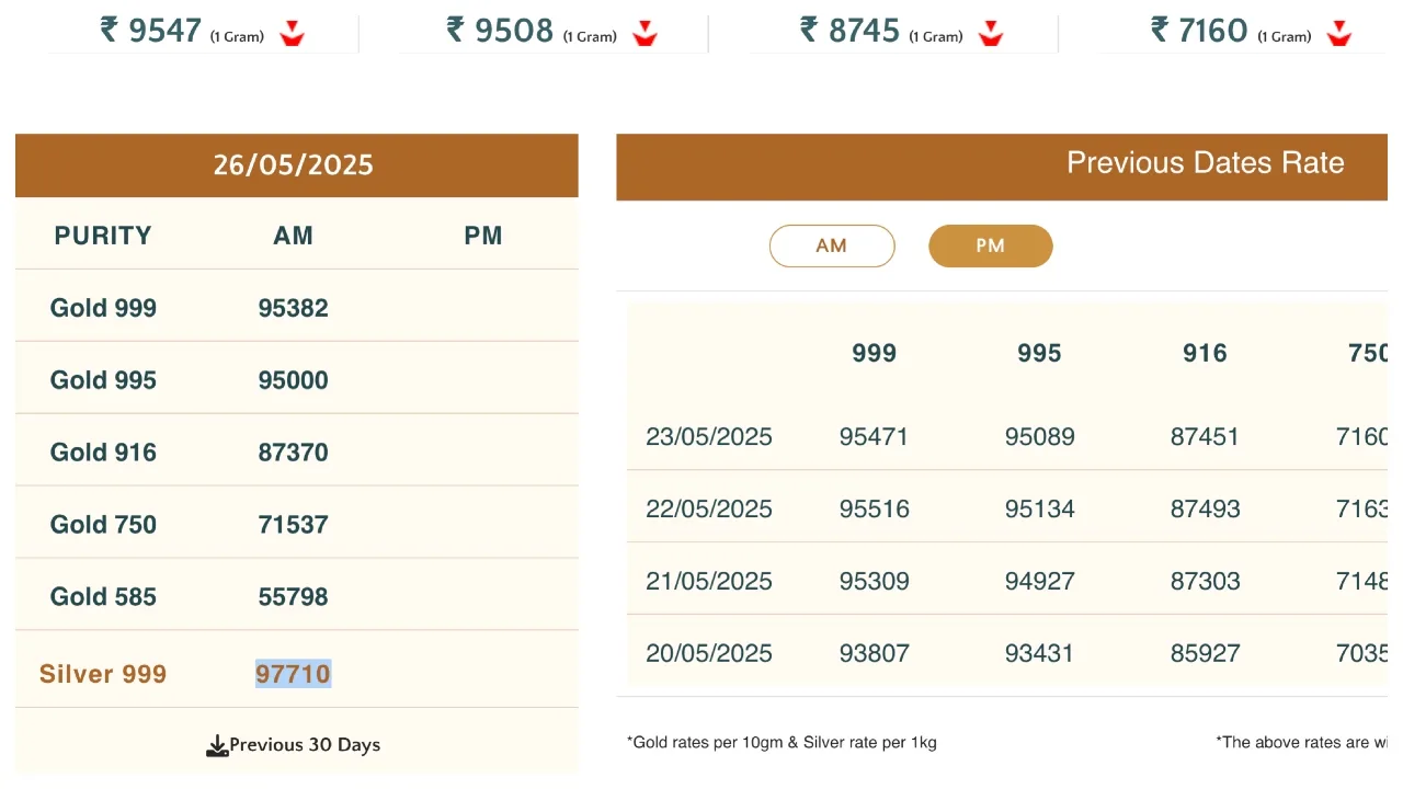 Please note that all gold and silver rates mentioned here include charges and GST. The rates issued by IBJA are uniform nationwide. No GST is included in this. GST must be paid separately on the making charge if you have jewellery made.