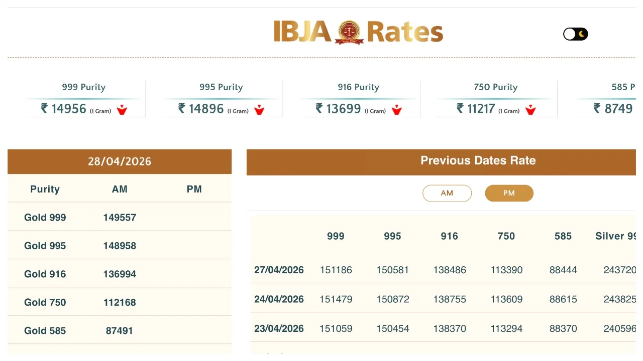 | Gold (24K – IBJA) | ₹1,49,557 per 10g | ▼ -₹1,629 |