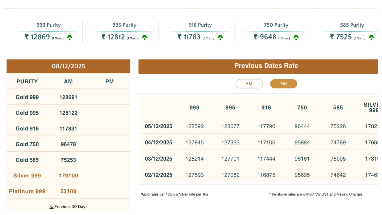 18-carat gold rose by ₹34 to ₹96,478 per 10 grams, and with GST, its price reached ₹99,372 per 10 grams. However, making charges is not yet included.
