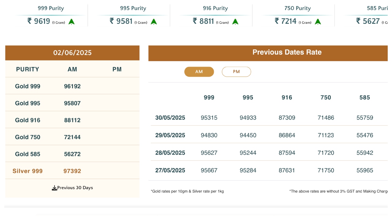 Please note that all gold and silver rates mentioned here include charges and GST. The rates issued by IBJA are uniform throughout the nation. No GST is included in this. GST must be paid separately on the making charge if you have jewellery made. IBJA releases the rate twice a day. Once around noon, and the other around 5 pm.