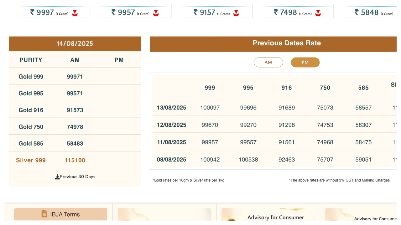 Gold Price Today: The rates of gold and silver have confused many people. Sometimes, the prices of gold increase rapidly, and at other times, there is a slight decline in the prices of gold. In such a situation, the most significant tension for women is how to buy gold. There has been a slight decline in the prices of gold and silver on Thursday, August 14. According to the India Bullion and Jewellers Association (IBJA), the price of 24-carat gold has come down by Rs 126 to Rs 99,971 per 10 grams. Earlier, the price of gold was Rs 1,00,097 per 10 grams.