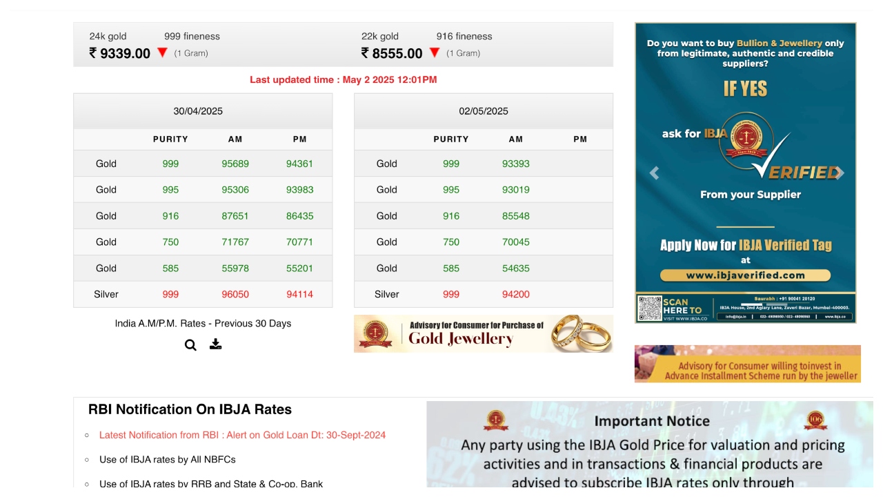 Please note that all gold and silver rates mentioned here are inclusive of charges and GST. The rates issued by IBJA are uniform nationwide. No GST is included in this. If you have jewellery made, then GST must be paid separately on the making charge.
