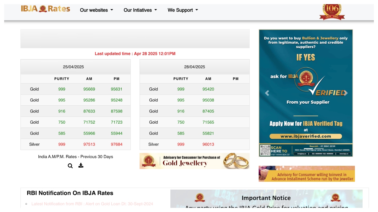Please note that all gold and silver rates mentioned here are inclusive of charges and GST. The rates issued by IBJA are uniform throughout the country. No GST is included in this. If you have jewellery made, then GST must be paid separately on the making charge.