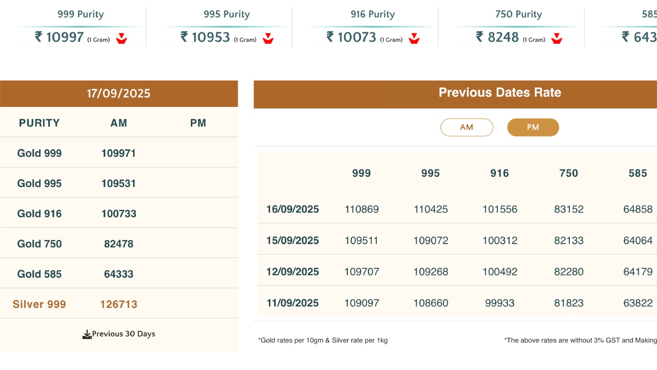 Meanwhile, the price of silver has fallen by ₹2,587 to ₹1,26,713 per kilogram. Previously, silver had reached an all-time high of ₹1,29,300. If you’re considering buying gold, let’s take a look at the latest gold rates:
