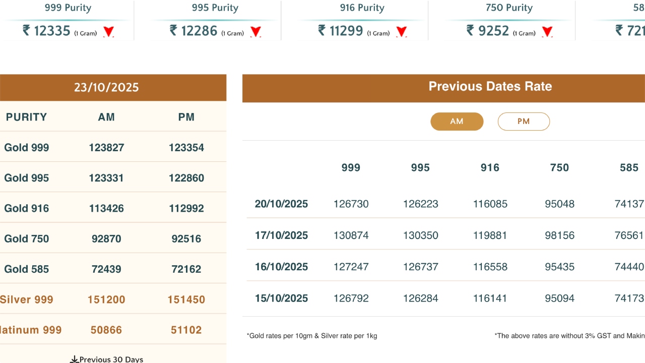According to the India Bullion and Jewellers Association (IBJA), the price of 24-carat gold has fallen to 1,23,354 rupees per 10 grams. Previously, the cost of gold was 1,23,827 rupees per 10 grams. The price of 10 grams of 22-carat gold has fallen to ₹1,12,992, down from ₹1,13,426. The cost of 10 grams of 18-carat gold has fallen to ₹92,516, down from ₹92,870. Silver prices have also declined alongside gold, falling to ₹1,51,450 per kg from ₹1,52,200 per kg.