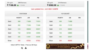 इंडिया बुलियन एंड ज्वैलर्स एसोसिएशन (India Bullion And Jewellers Association) के अनुसार, आज यानी 2 जुलाई की सुबह 995 शुद्धता वाले सोने का रेट 71570 रुपये प्रति 10 ग्राम है। जबकि, इसके अलावा 916 शुद्धता वाले सोने के दाम 65822 रुपये प्रति 10 ग्राम है। इसके अलावा 750 (18 कैरेट) प्योरिटी वाले सोने का रेट 53894 रुपये प्रति 10 ग्राम है। वहीं, 585 (14 कैरेट) प्योरिटी वाले सोने का दाम 42037 रुपये प्रति 10 ग्राम है।
