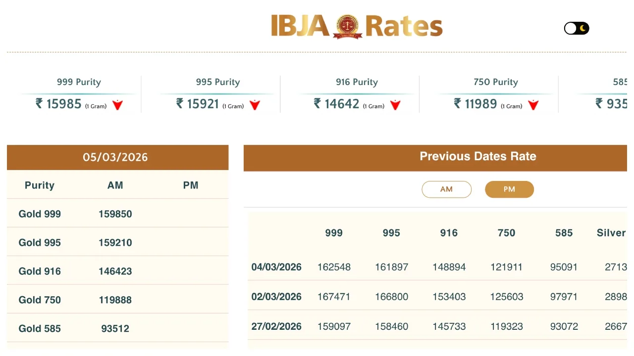 Today, March 5th, 999-purity gold, without GST, has fallen by ₹2,698 per 10 grams from Wednesday’s closing price, to ₹159,850. Gold has fallen by only ₹16,271 from its all-time high of ₹176,121 in the bullion market. Including GST, gold today reached ₹164,645. 22-carat gold is now priced at ₹150,815 per 10 grams, including GST. Meanwhile, 18-carat gold has reached ₹123,484 per 10 grams.