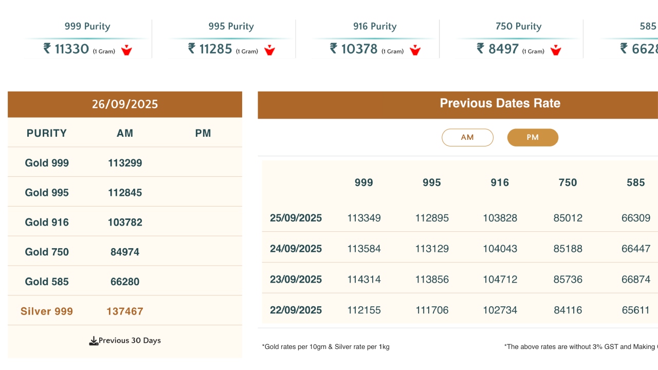 The price of 18-carat gold has dropped by ₹38 to ₹84,974 per 10 grams. With GST, it has reached ₹87,523 per 10 grams. Meanwhile, 14-carat gold has fallen by ₹29 to ₹66,280 and has reached ₹68,268 with GST.