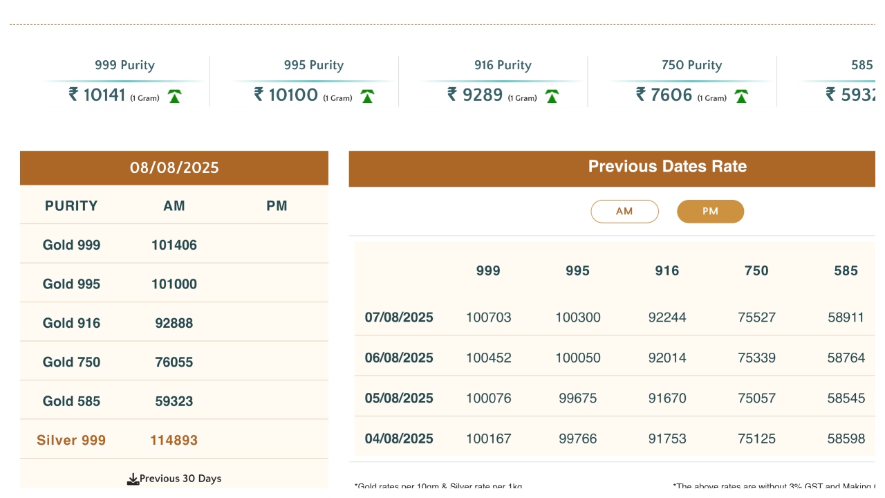 According to the website of IBJA, the price of 995 purity gold increased to Rs 101000 per tola on August 8. Apart from this, the price of 22 carat gold of 916 purity increased to Rs 92888 per tola on Thursday. Apart from this, the price of 18 carat gold of 750 purity is ₹ 76055 per tola. At the same time, the price of 14 carat gold has reached ₹ 59323 per 10 grams. GST and making charge are not included in this. The price of silver is ₹ 114893 per kg.