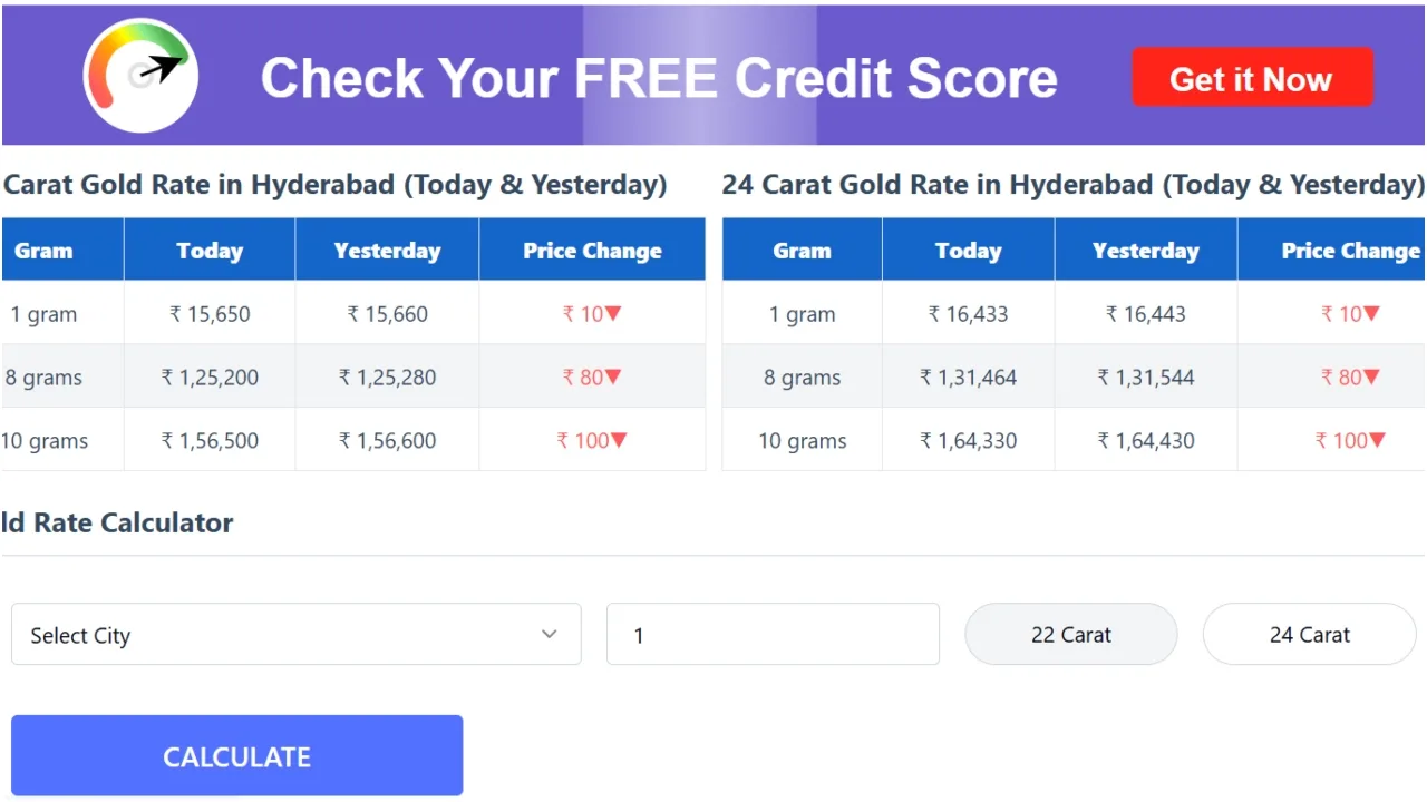 In Hyderabad, the rate of 22-carat gold fell by ₹100 to ₹156,500 per ten grams. 24-carat gold was trading at ₹164,330 per ten grams. On Tuesday, 22-carat gold was trading at ₹156,600, and 24-carat gold was trading at ₹164,430 per ten grams.
