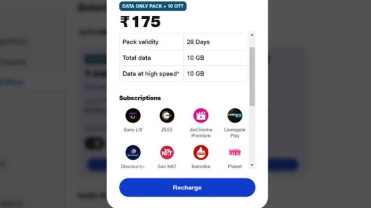 This is a data-only pack plan from Reliance Jio, which is available with a validity of 28 days. In this plan, you are being given 10GB of extra data. On the other hand, if you are fond of watching OTT, then users are getting apps like SonyLIV, ZEE5, Lionsgate Play, Discovery+, SunNXT, Kanchha Lannka, Planet Marathi, Chaupal, Hoichoi, and JioTV.