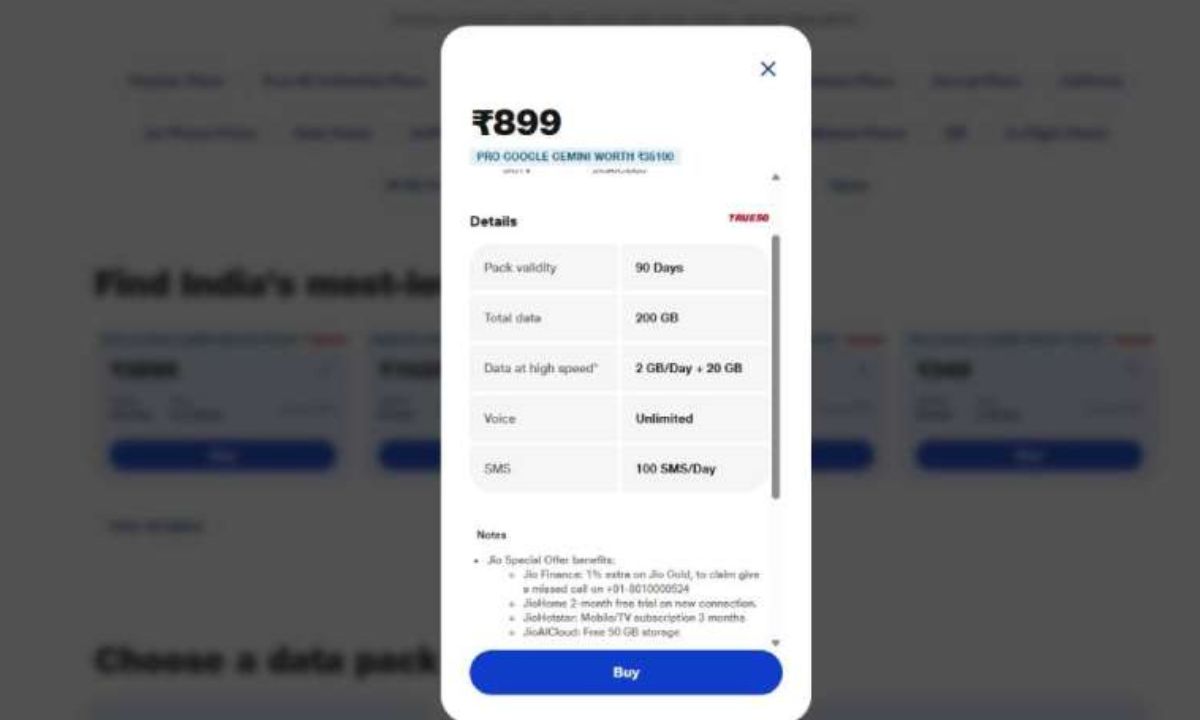 This prepaid package also offers free access to Jio TV and Jio AI Cloud. 50GB of free storage is available with Jio AI Cloud. Google and the company recently teamed. Also, the deal offers customers a ₹35,100 Gemini Pro a member.