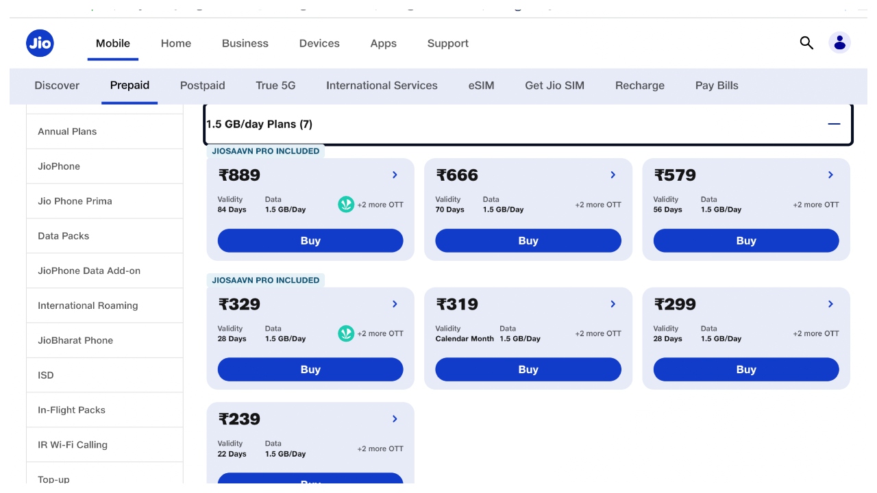 Jio’s Rs 799 plan has been removed from the company’s official website. It will no longer be listed in the plans with 1.5GB daily data. If you need 1.5GB of daily data every day with long validity, then you will have to pay Rs 889.