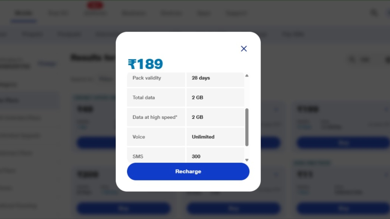Jio ₹189 plan is the best value-for-money plan. It includes 2GB data, unlimited call, and 300 SMS for 28 days, making it one of the best packages. The customers are also spoiled with Jio entertainment services like Jio TV and Jio Cinema. It is the best package for anyone looking for a cheap, reliable, and complete package for mobile use.