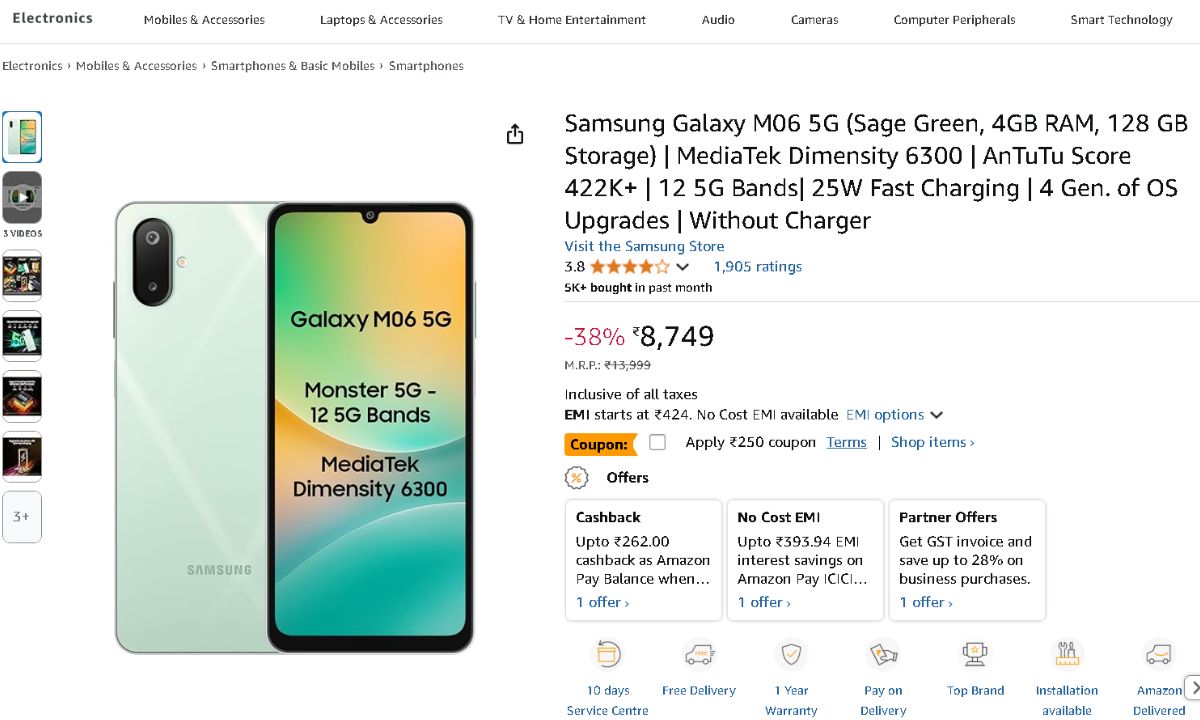 The Samsung Galaxy M06 5G is a good choice if you are looking to get a Samsung 5G phone on a tight price. The unique feature is that you can buy it at the lowest price during Amazon’s Great Freedom Sale. This phone, which has 128GB of internal storage and 4GB of RAM, prices Rs 8749. At the Great Freedom Sale, a coupon discount of Rs 250 is being offered over the phone. You can purchase this phone for Rs 8499 with this discount.