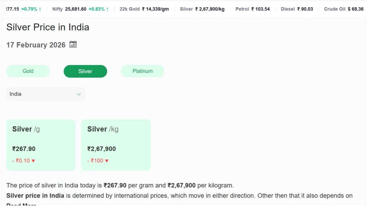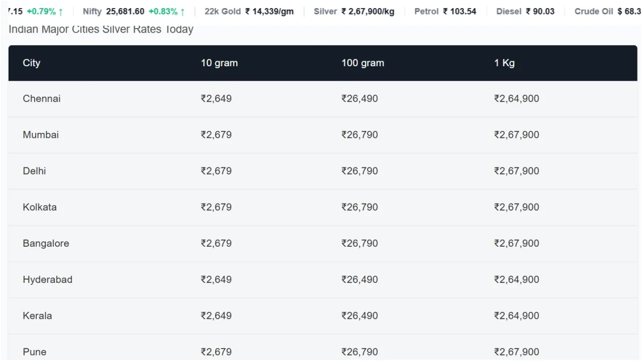 Additionally, the price of one kilogram of silver is trending at ₹267,900 per kilogram. In New Delhi, the price of 100 grams of silver has fallen to ₹26,790, and the price of 1 kilogram of silver has fallen to ₹267,900 per kilogram.