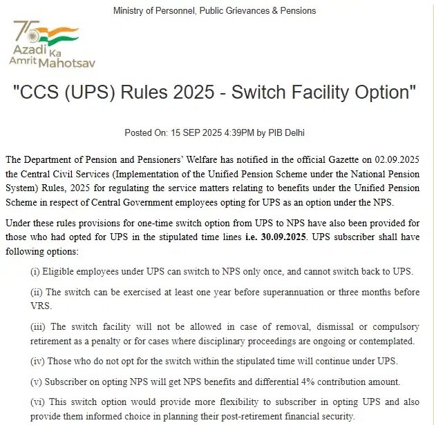 Now the government issued a press release on 15 September 2025, clarifying that now the employees involved in UPS will be given the option to go to NPS (National Pension System) once. This option can be used only once and once the NPS is chosen, the employee will not be allowed to return to UPS again. Let us tell you that its purpose is to give flexibility to the employees to plan their retirement financial security in a better way.