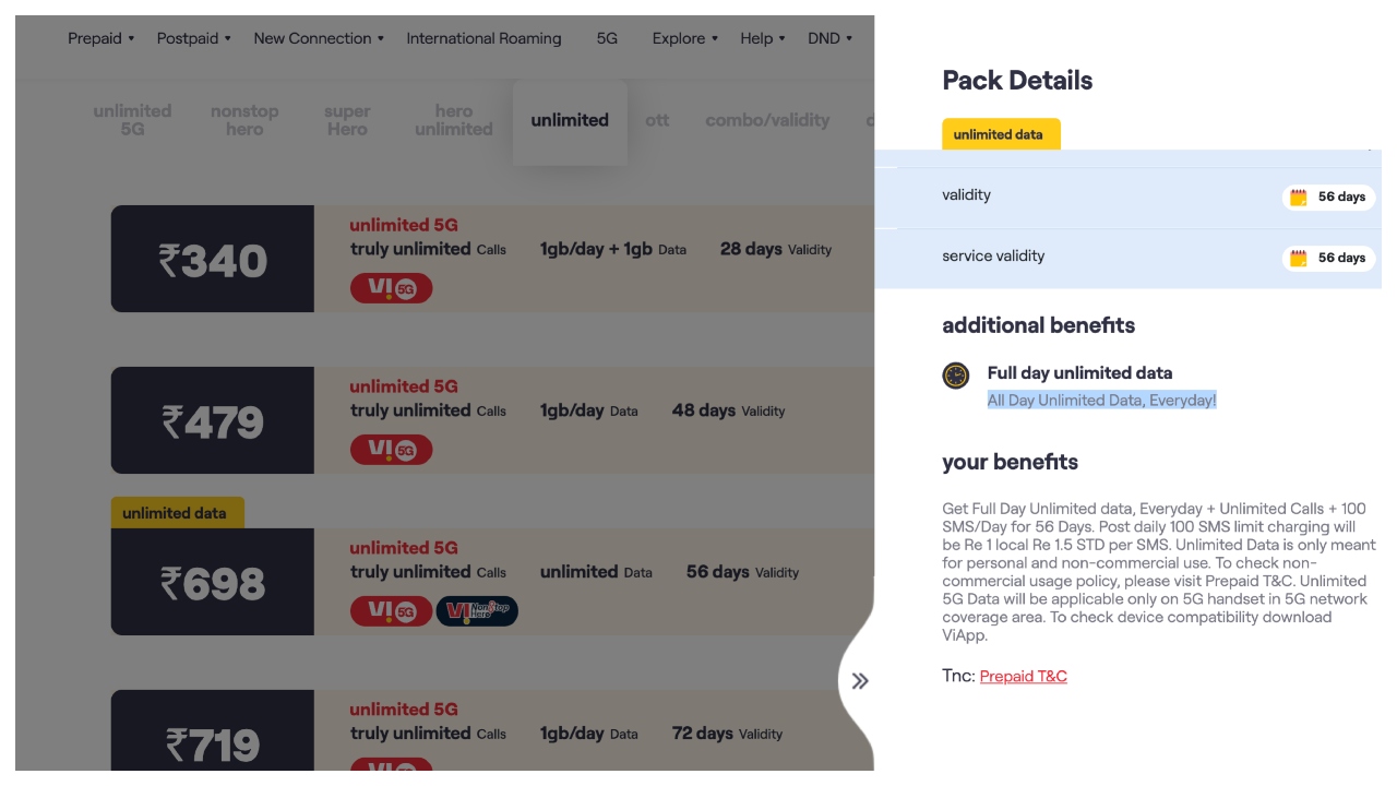 Vodafone is offering a validity of up to 56 days with the Rs 698 plan. Additionally, the plan offers unlimited data. That is, you can use any amount of data. Apart from this, unlimited calling facility is also being given to the user in. The plan provides the facility of sending 100 free SMS every day to any number. Customers benefit from unlimited data. That is, you can avail the benefit of All Day Unlimited Data daily.