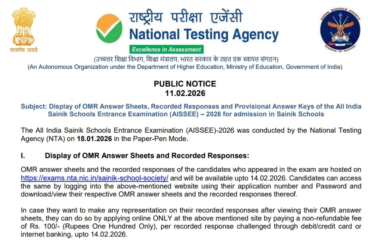 AISSEE 2026 Answer Key 2026: Big news is coming for students appearing for the All India Sainik School Entrance Exam for classes 6 and 9. The National Testing Agency has made the provisional answer key and response sheet for the exam available for download on the official website. The answer key and response sheet are available online on the NTA’s official website: exams.nta.nic.in/sainik-school-society/