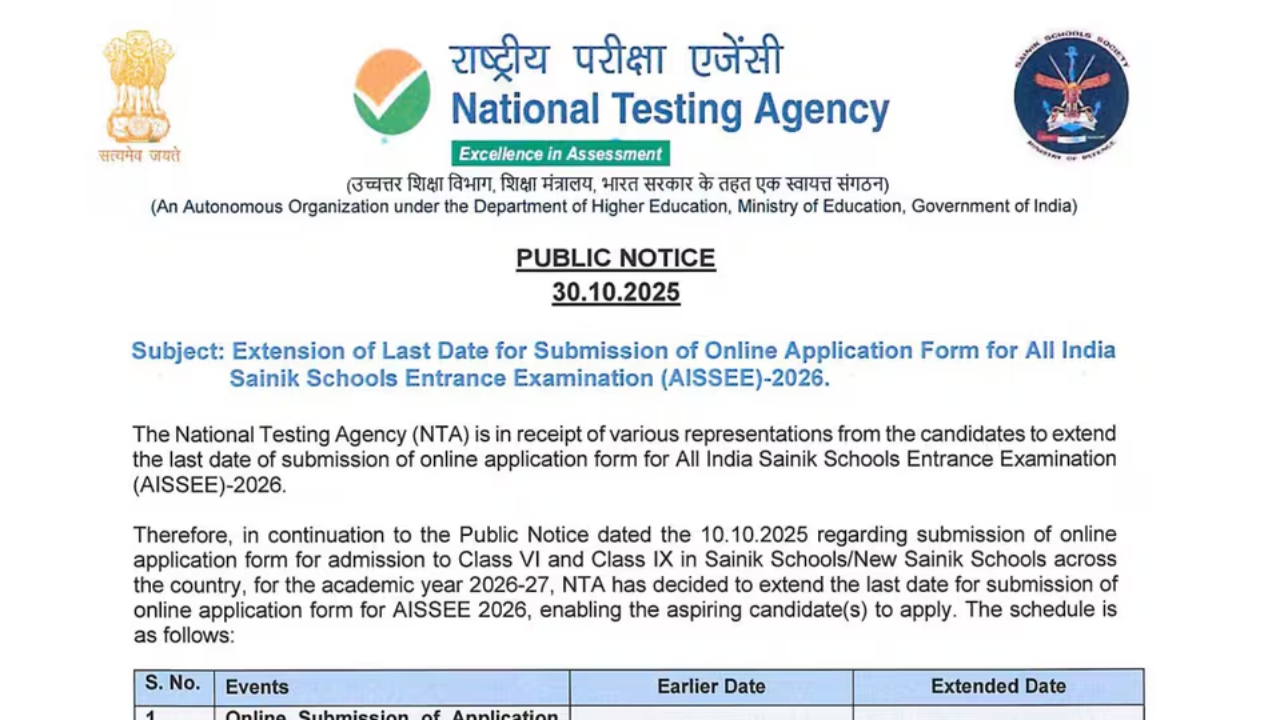AISSEE 2026 Registration. The National Testing Agency (NTA) has extended the registration deadline for the All India Sainik School Entrance Exam (AISSEE 2026). Previously, the deadline was October 30, 2025, but now candidates can apply until November 9, 2025. This decision is a relief for those who, for some reason, were unable to fill out the application form by the deadline. Here are some key information about AISSEE 2026 to help you apply on time.