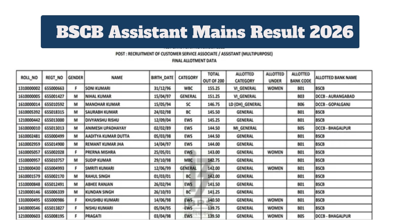 BSCB Assistant Result 2026 Announced: Bihar State Cooperative Bank Limited has released the results for the Assistant and CSA Main Examination. Candidates who appeared for the examination have been eagerly awaiting their results. They can now download their results by visiting the official website. The Assistant Main Examination result has been released as a PDF. A total of 257 candidates will be selected through this recruitment examination. The examination was held on August 31, 2025, and the Main Examination was held on November 17, 2025. Let’s learn how to download the results.