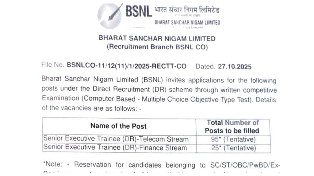 BSNL Recruitment 2025: If you’re dreaming of working at the state-owned telecom company BSNL, there’s good news for you. Bharat Sanchar Nigam Limited (BSNL) has announced recruitment. The best part is that even freshers can apply. BSNL has announced vacancies for Senior Executive Trainees in the telecom and finance streams. According to the BSNL notification, this recruitment drive will select eligible candidates for 120 positions. The notification for this recruitment was released on October 27th. The application process will begin soon on the official website, bsnl.co.in.