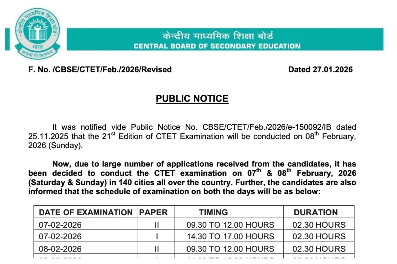 CBSE CTET Admit Card 2026: The Central Board of Secondary Education (CBSE) may release the CTET admit card at any time. Candidates who registered for the CTET exam are awaiting their hall tickets. The admit card will soon be available for download on the official website ctet.nic.in. All candidates are advised to monitor the official website. According to the new notice released on the official website ctet.nic.in, the CTET exam will be held on February 7 and 8, 2026, in 140 cities.