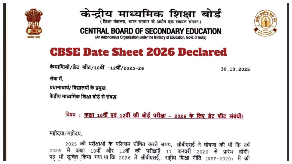 CBSE Board Exam 2026 Date Sheet:- The Central Board of Secondary Education has released the date sheet for the CBSE Class 12 Board Exam 2026. The CBSE Class 12 exams are scheduled to begin on February 17, 2026. According to the released datesheet, the CBSE Class 12 board exams 2026 will be held by April 9, 2026. Candidates scheduled to appear for the Class 10 or 12 board exams this year can download their final date sheet from the CBSE’s official website, www.cbse.gov.in. According to the official CBSE notification, the Class 10 and 12 exams are scheduled to begin on February 17, 2026. The board has also clarified that, in accordance with the National Education Policy, the Class 10 board exams will be conducted twice.