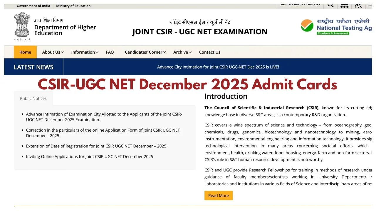 CSIR-UGC NET December 2025 Admit Cards: The National Testing Agency (NTA) is expected to release the admit cards for the CSIR UGC NET December 2025 examination soon. Candidates who have applied for the exam are eagerly awaiting their admit cards. Candidates appearing for the exam can download their admit cards from the official website at csirnet.nta.nic.in once released.