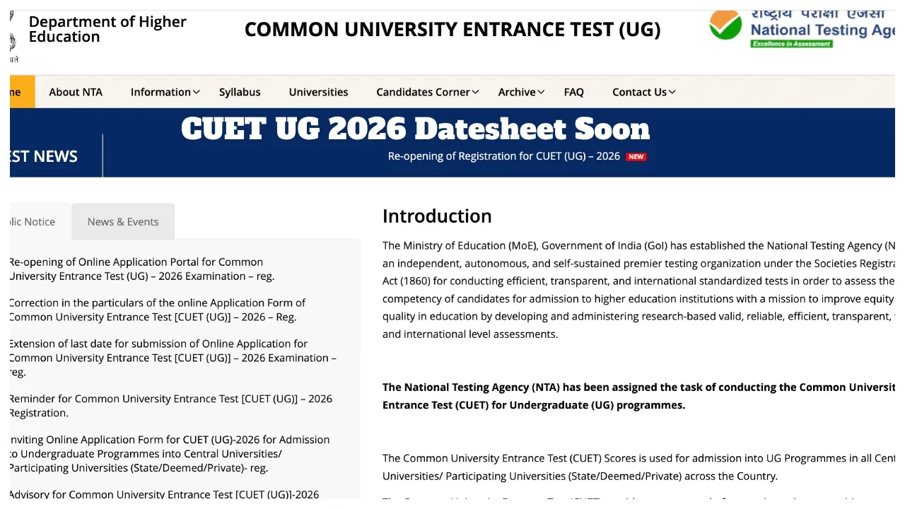 CUET UG 2026:- The National Testing Agency (NTA) is expected to release the subject-wise date sheet for CUET UG 2026 very soon on the official website, cuet.nta.nic.in. It is estimated that the entrance exam will be held between May 11 and May 31, 2026. However, no official information has been shared regarding the exam date. All candidates who have applied for admission to undergraduate courses at various central universities and other participating institutions across the country will soon be able to check their exam schedule through the official website, cuet.nta.nic.in.
