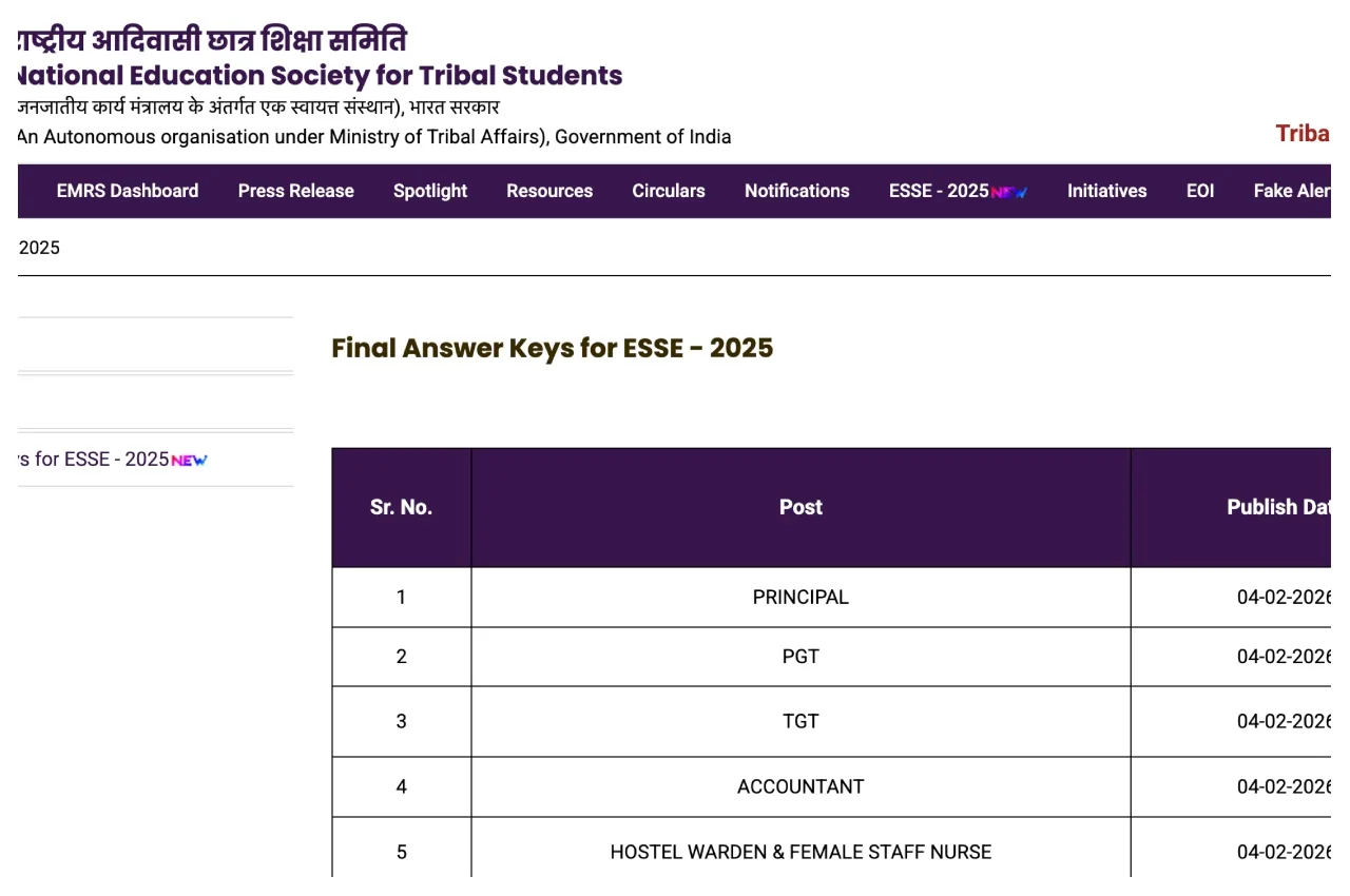 EMRS Final Answer Key 2026 Released – Download ESSE Post-Wise PDF Link at nests.tribal.gov.in