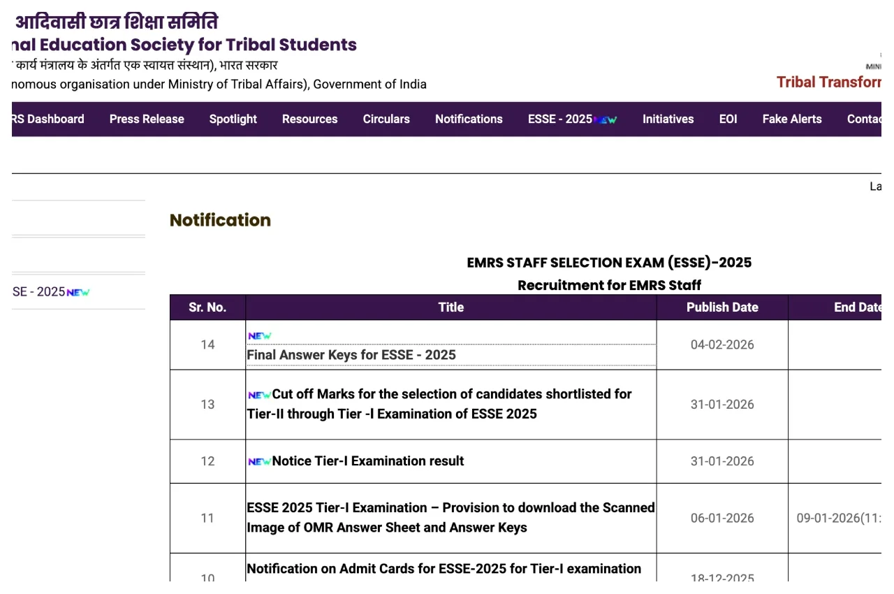 EMRS Final Answer Key 2026 Out: The final answer key for the recruitment examination for teaching and non-teaching positions at Eklavya Model Residential Schools under the National Tribal Students Education Society has been released. Candidates who appeared in this recruitment examination were eagerly awaiting their final answer key. Now, candidates can download the final answer key from the official website.
