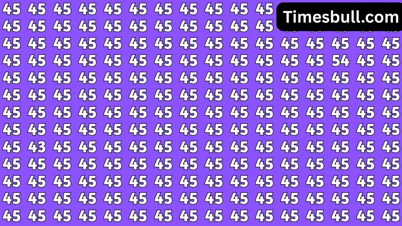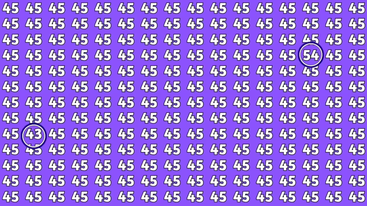 To solve this puzzle, carefully scan the screen and focus on the numbers in each row. The upside-down ’54’ is hidden in the top row, on the right. ’43’ can be found in the fifth row, on the left. At first glance, it looks like ’45,’ but upon closer inspection, the numbers appear to be interchanged.