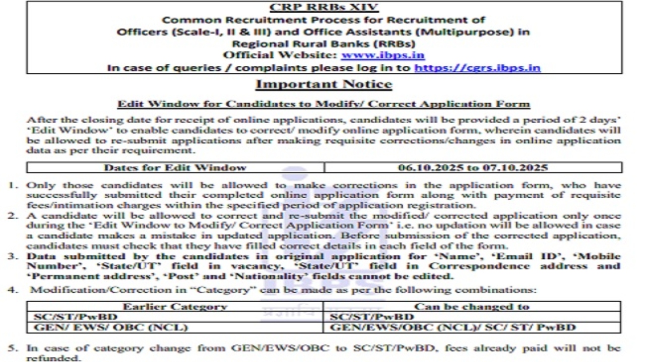 IBPS RRB 2025: Good news for candidates who made mistakes while filling out the application form for the IBPS PO and Clerk Recruitment 2025. Starting October 6th, IBPS activated the online correction window on the Institute of Banking Personnel Selection’s official website, www.ibps.in. Candidates can make amendments to their application forms until October 7th. Corrections can only be made online.