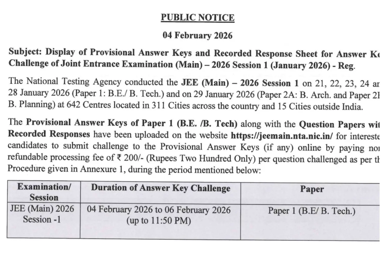 NTA JEE Mains 2026: The National Testing Agency (NTA) released the answer key and response sheet for the JEE Main Session-1 exam today, February 4th. Candidates can now download their answer key through the official website. Along with the answer key, candidates’ individual response sheets and the official question paper have also been made available.