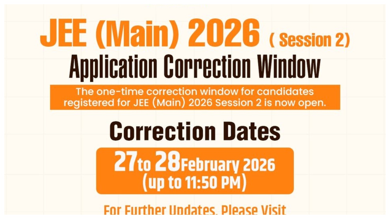 JEE Main Session 2 Application Correction Window: The National Testing Agency (NTA) has opened the application form correction window for the second session of the Joint Entrance Examination (JEE Main) exam. All candidates who have applied for the JEE Main 2026 Session 2 exam can make corrections until February 28th. Candidates can make changes to their application forms by logging in to the official website, jeemain.nta.nic.in. The correction window is only available to students who have completed the JEE Main 2026 Session 2 application form by February 25th, 2026.