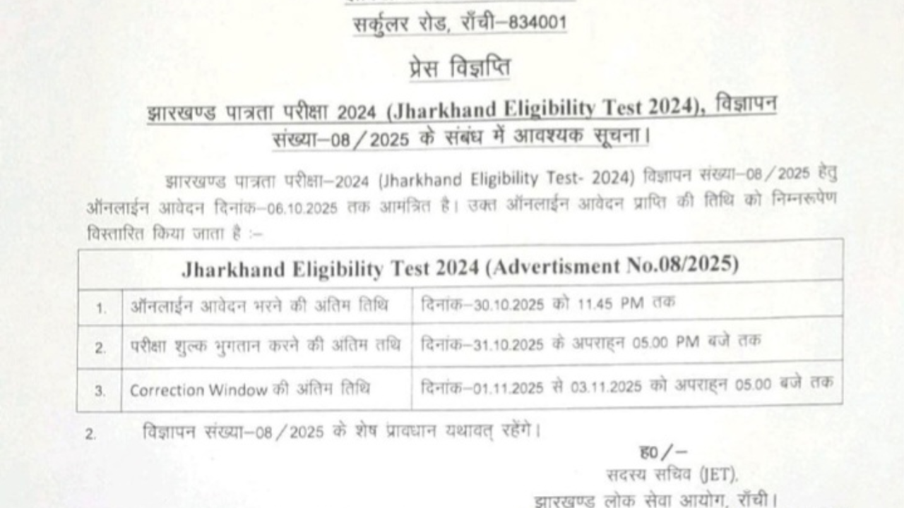 Jharkhand JET 2025. The last date to apply for the Jharkhand Eligibility Test (JET) 2025, conducted by the Jharkhand Public Service Commission (JPSC), is today, October 30, 2025. Candidates who have not yet applied have this last chance. Candidates can apply online by visiting the JPSC’s official website, jpsc.gov.in. The last date for submitting the application fee is October 31, 2025.