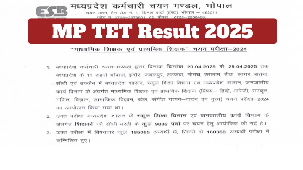 MPTET Result: The wait for candidates who took the Madhya Pradesh Teacher Eligibility Test (MP TET) exam is finally over. The MP Staff Selection Board, Bhopal, has released the MP TET result. Candidates who took the exam can now check their results through the official website, esb.mp.gov.in. Candidates will need to enter their registration number and date of birth to download the result.