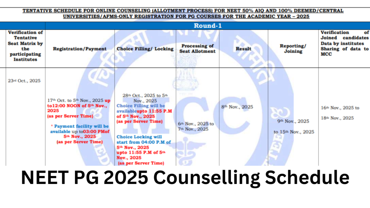 NEET PG 2025 counselling has begun on October 17, 2025, while the entire first round will continue until November 18, 2025. Below is the complete schedule for Round 1-