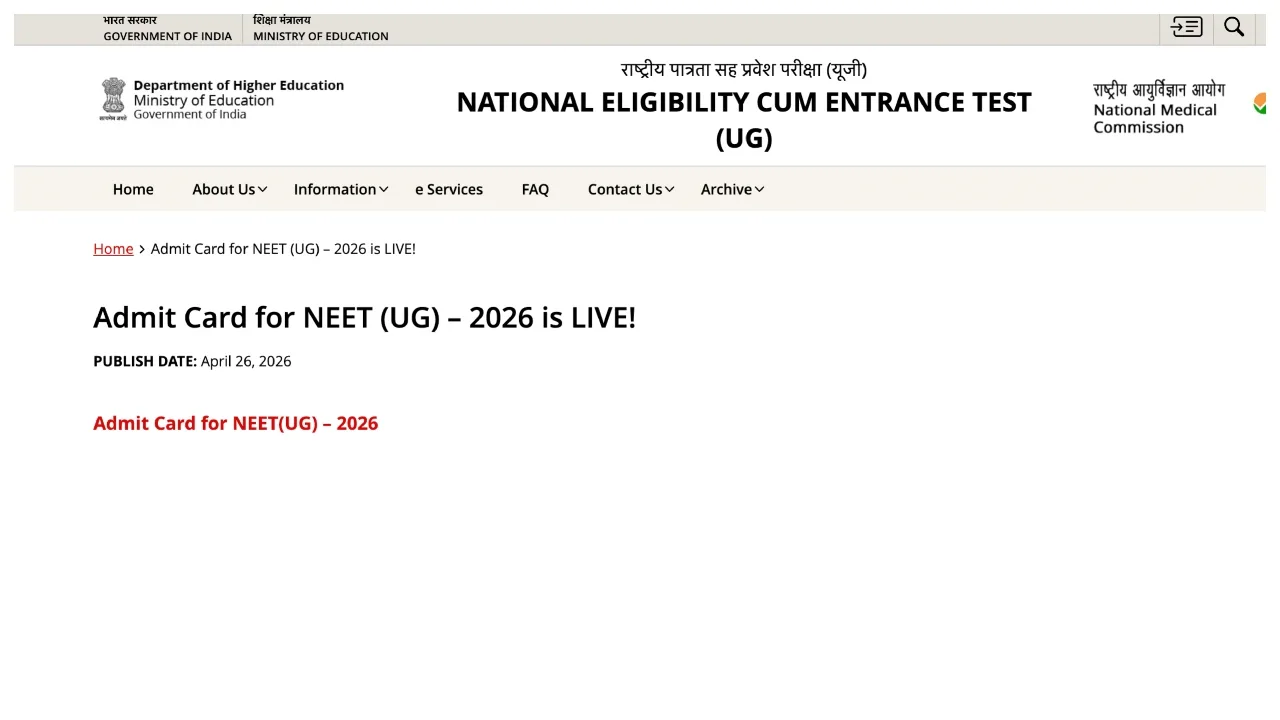 Stay updated & check all instructions carefully.#NEET2026 #NTA #AdmitCard pic.twitter.com/og2xzFkHpn— National Testing Agency (@NTA_Exams) April 26, 2026