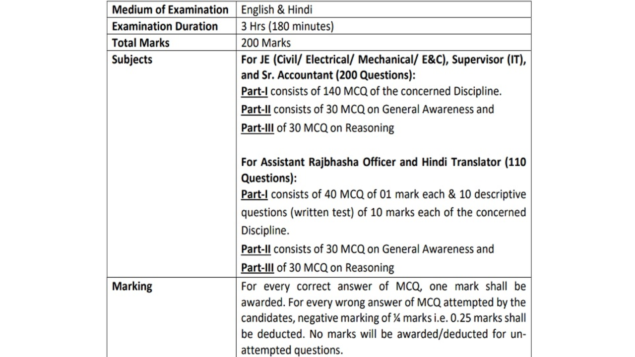 This exam will have a total of 200 questions, carrying 200 marks. Candidates will be given 3 hours (180 minutes) to complete the paper.